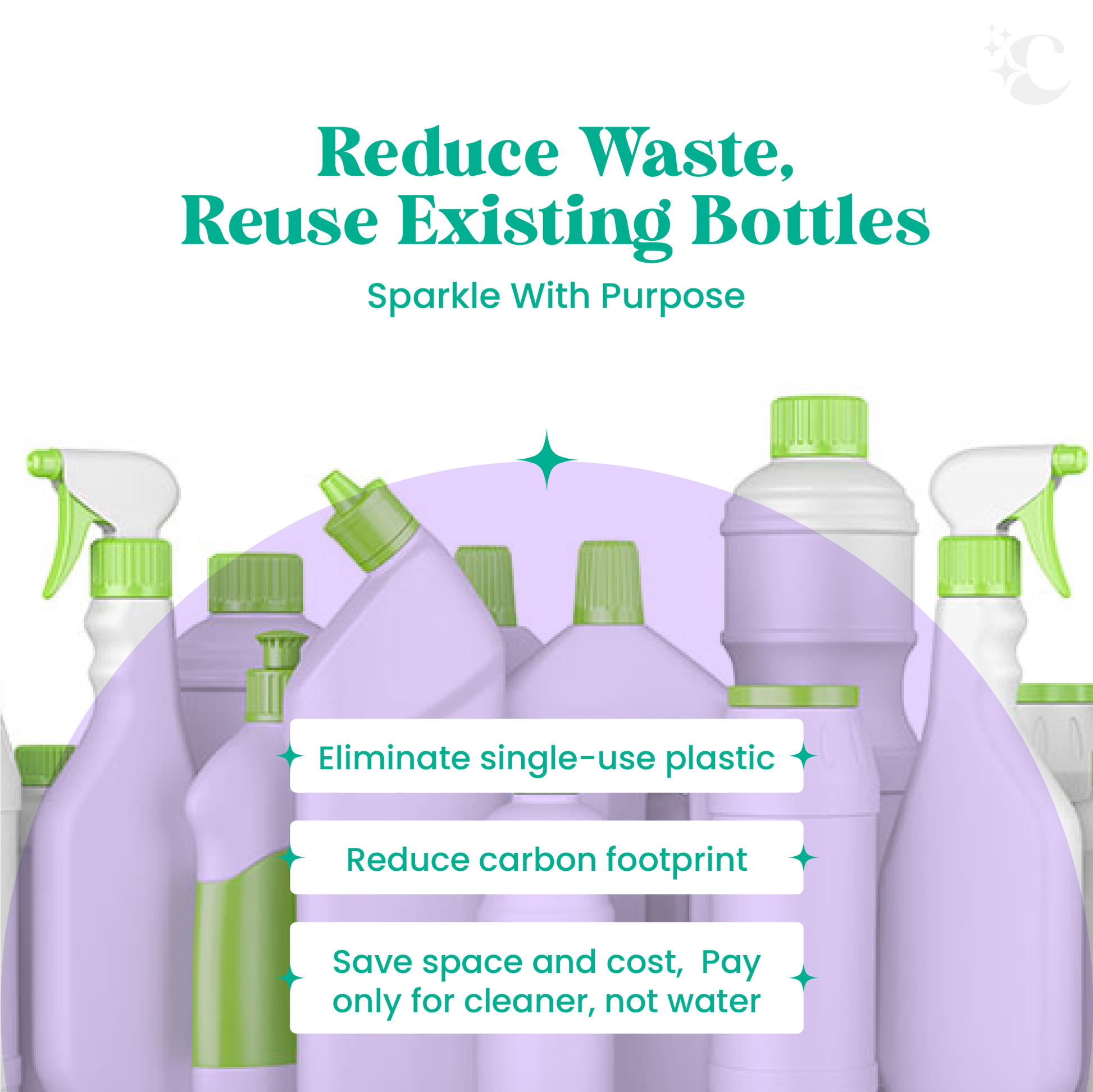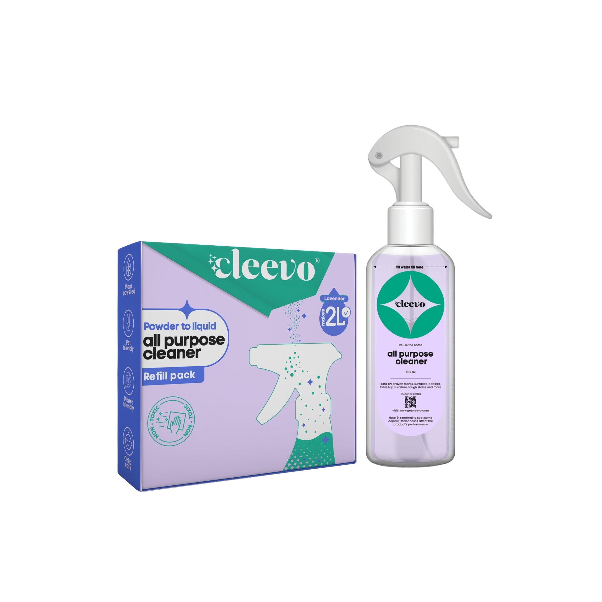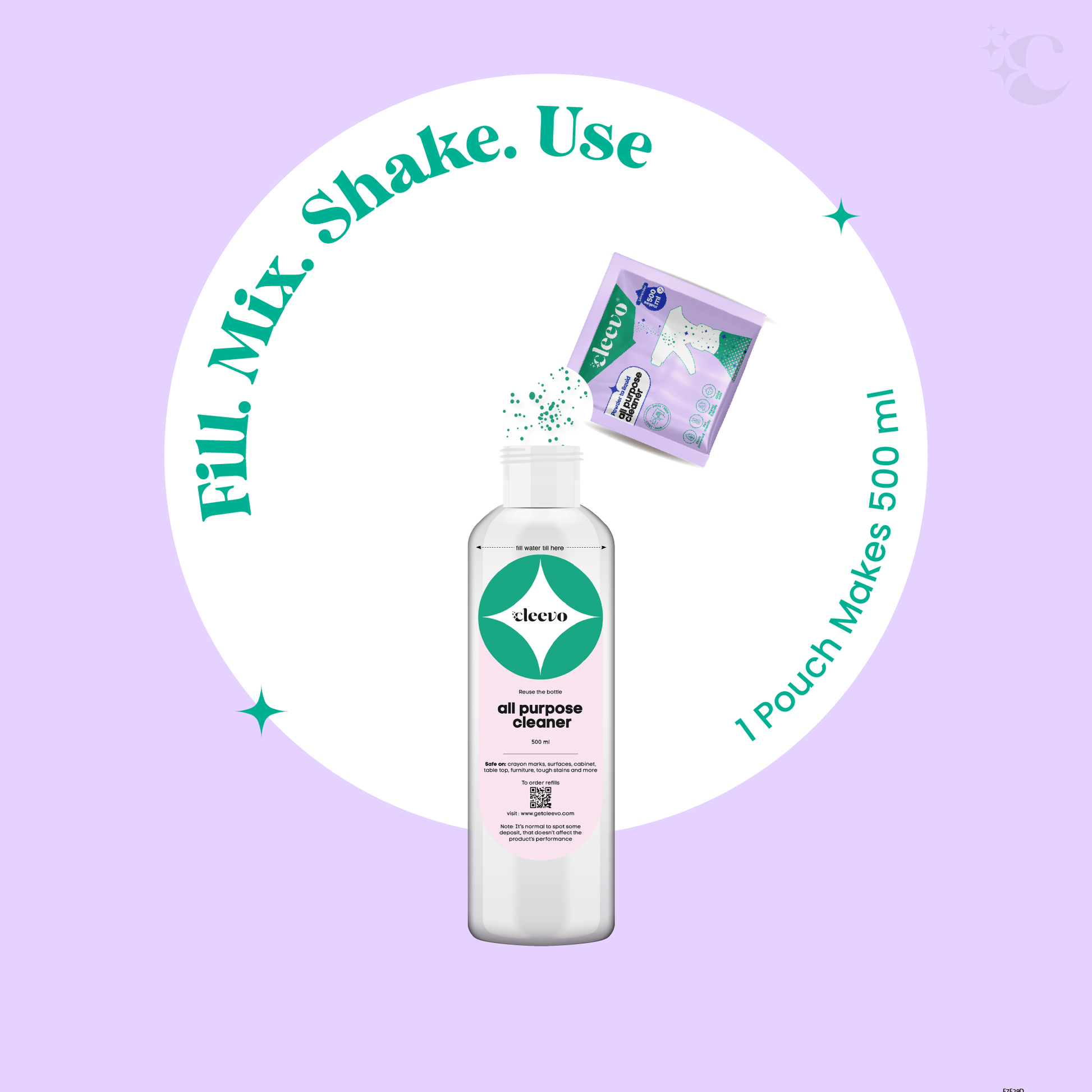 Grab a Cleevo cleaner sachet, mix it into our Cleevo bottle filled with water, secure, shake, wait 5-10 mins, and you're set! Check pouch instructions for more details.