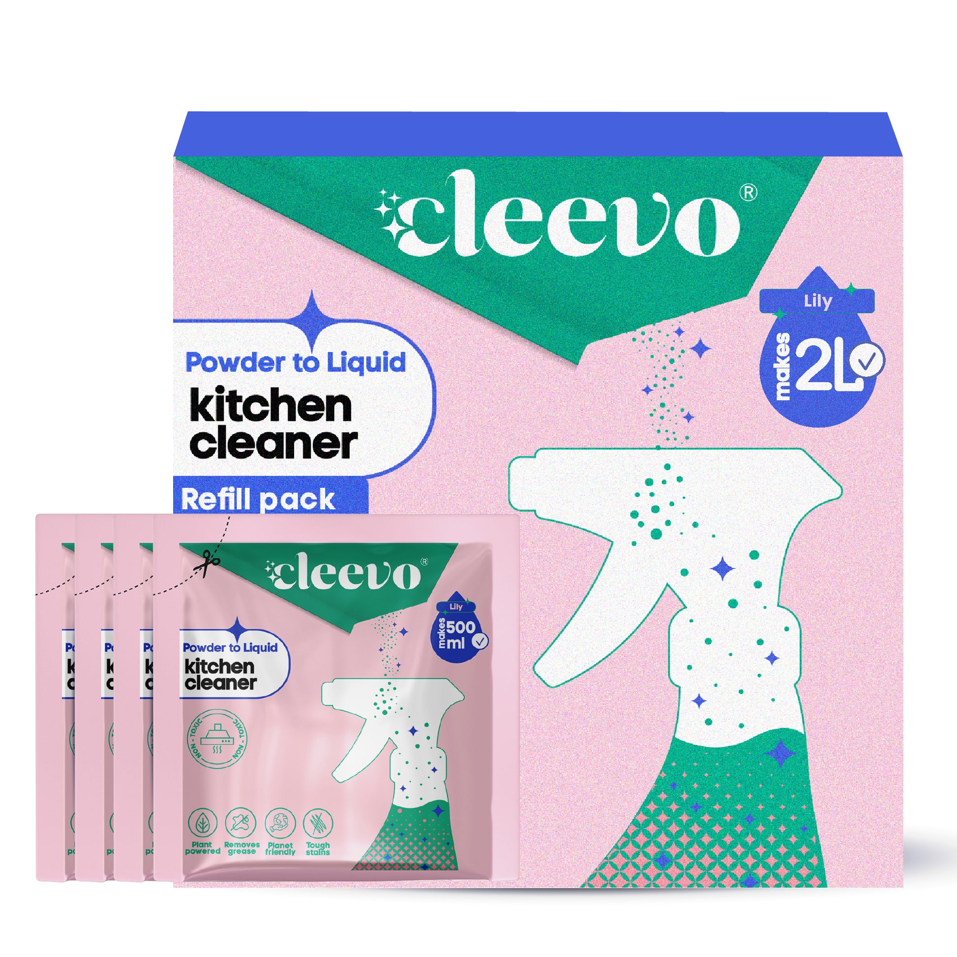 With each pouch, you can make 500 ml of Lily-scented kitchen cleaner. Simply mix with water, shake it up in any 500 ml spray bottle you have lying around, or opt for our stylish Cleevo bottle that you can reuse indefinitely.