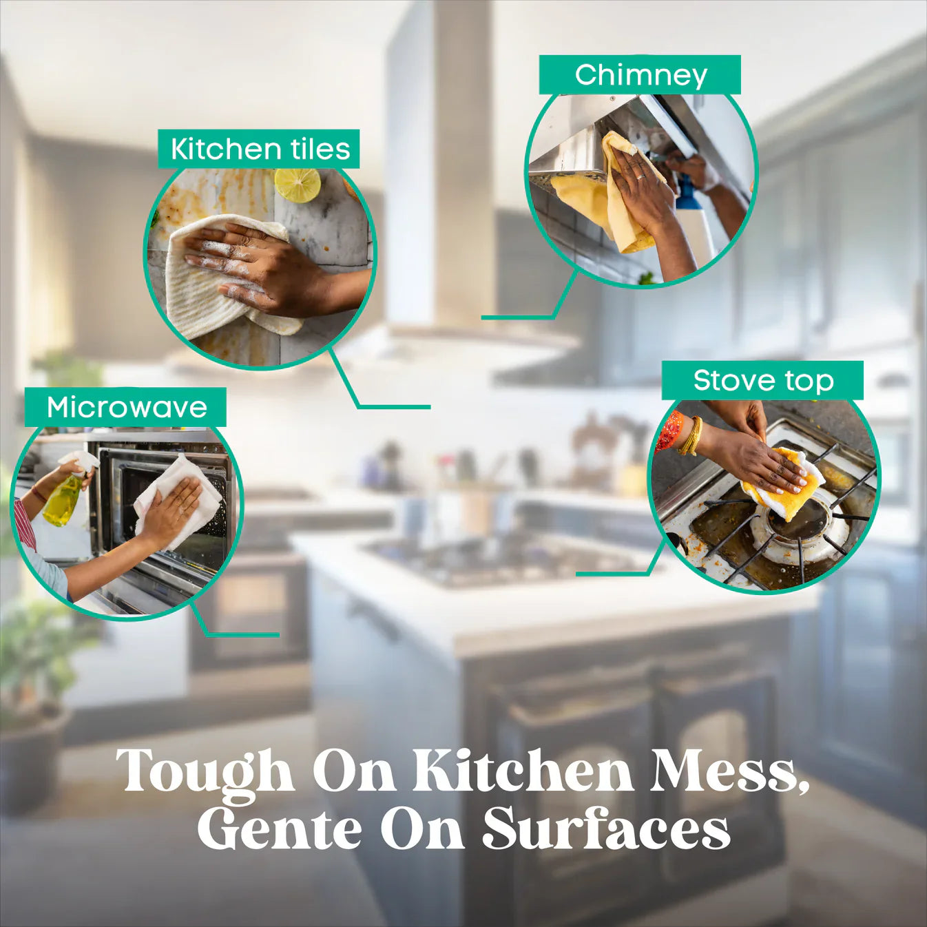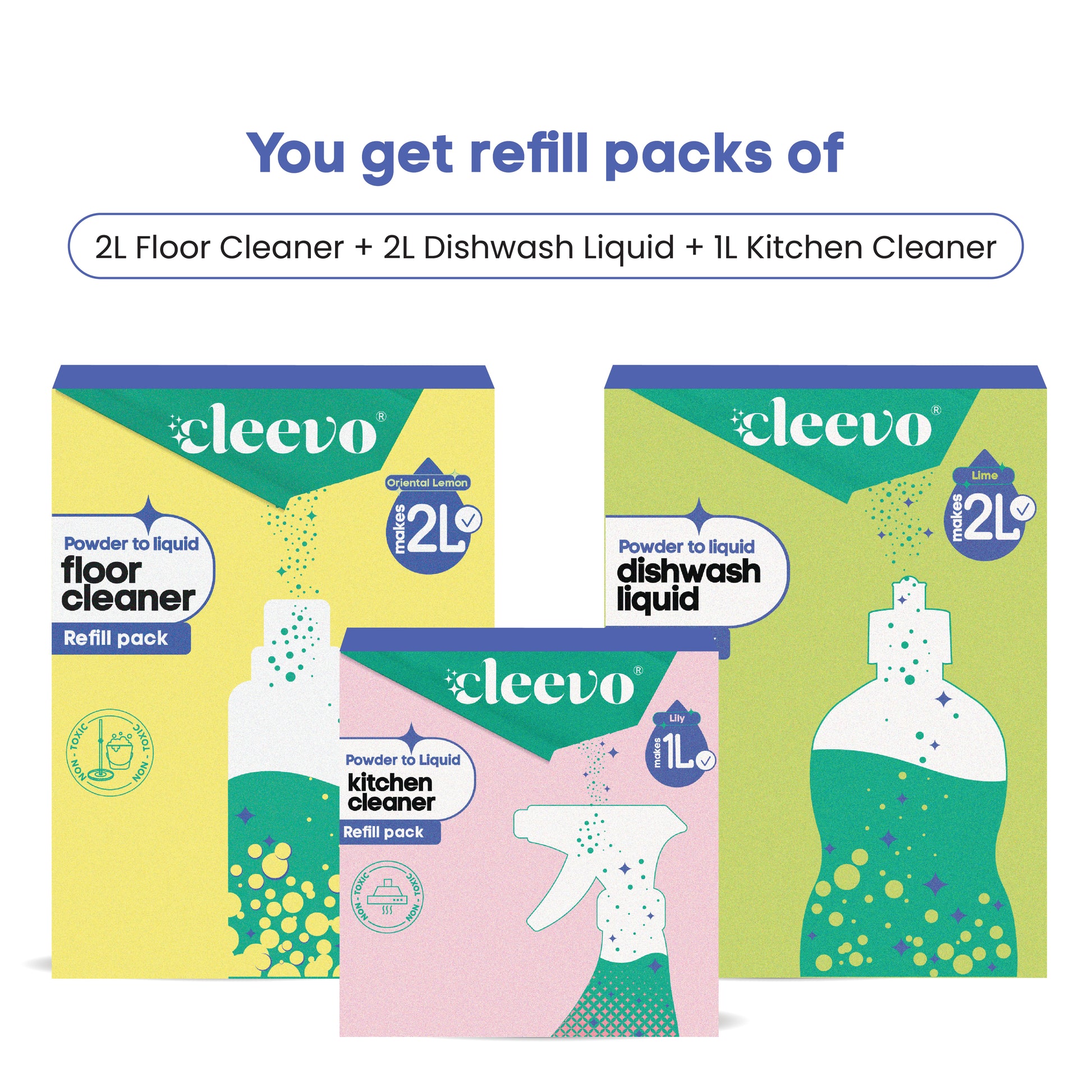 Get ready to save more and for a squeaky clean home with our Mega Saver Refill Pack! This all-in-one solution has got you covered for months. Inside, you'll find a powerful floor cleaner (2L), Dishwash liquid (2L), and Kitchen cleaner (1L), all made with carefully chosen non-toxic ingredients. Tough stains don't stand a chance against our expertly crafted formula, leaving your home looking and smelling fresh. Revive your floors with our special floor cleaner, and effortlessly tackle greasy kitchen tops, gas stove, chimney etc. And for sparkling clean dishes, don't forget our trusty dishwash liquid!