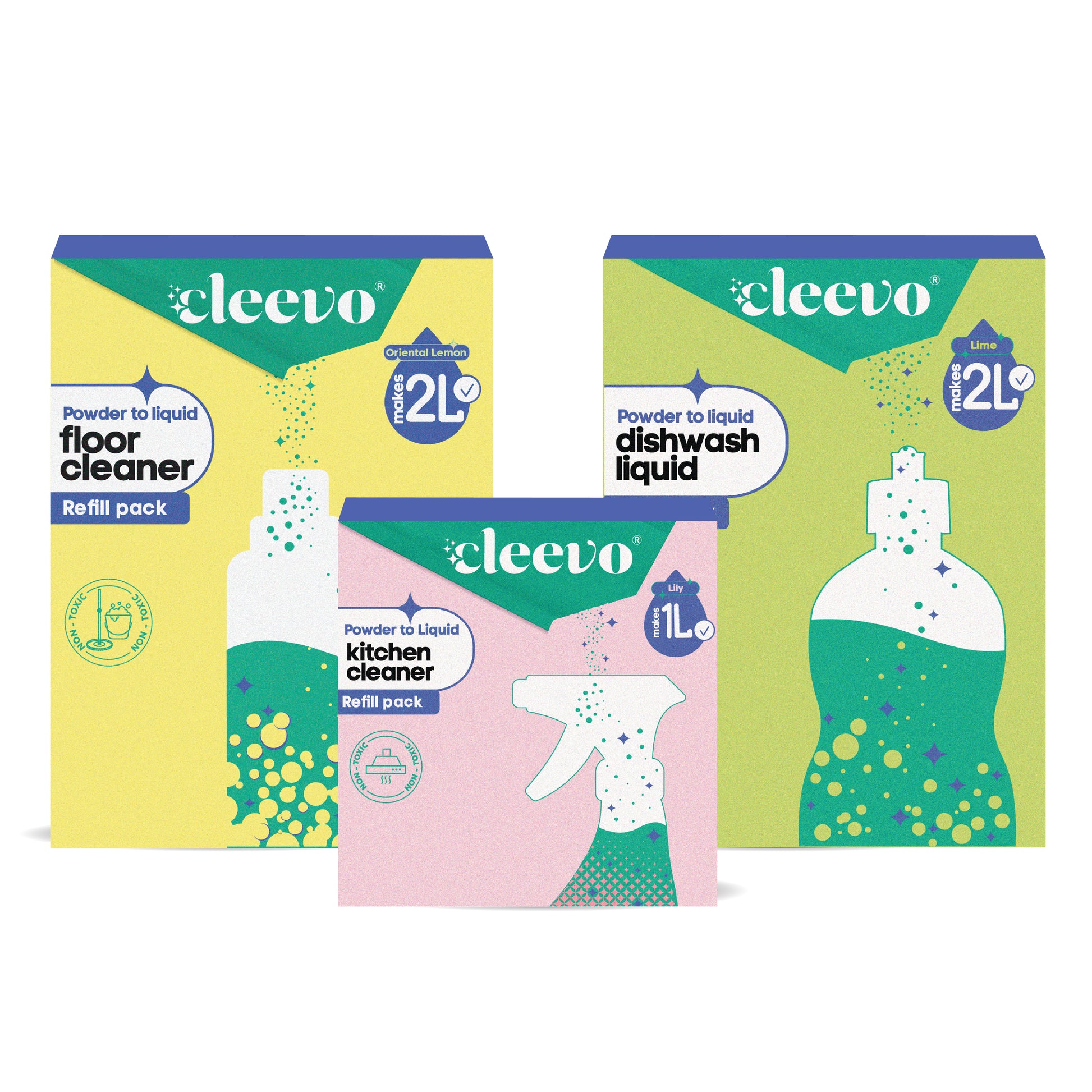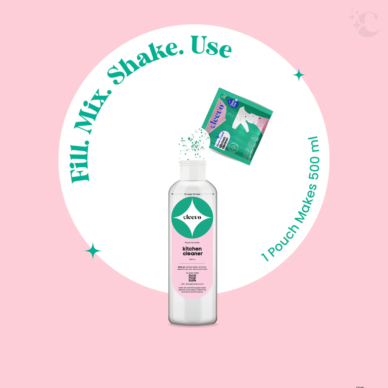 Grab a Cleevo cleaner sachet, mix it into our Cleevo bottle filled with water, secure, shake, wait 5-10 mins, and you're set! Check pouch instructions for more details.